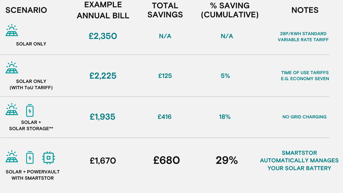 SMARTSTOR™ energy management software automatically manages your solar battery, generating even more savings. It learns your individual energy usage patterns, constantly scans the weather forecast, and knows your tariff, so that it can make the optimum daily decisions about how much cheap energy from the grid to store and how much battery capacity to leave available for your free surplus solar generation.